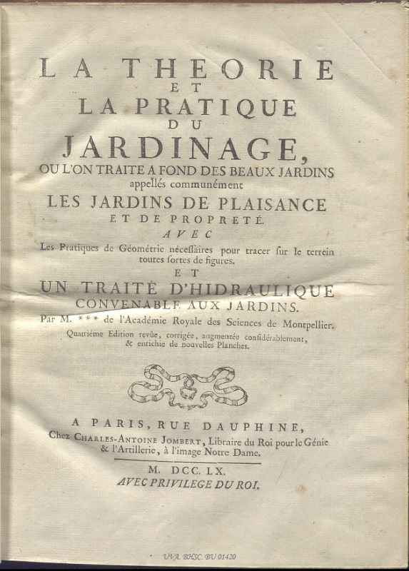 Antoine Joseph Dezallier d’Argenville (París, 1 de julio de 1680 - París, 29 de noviembre de 1765) fue un naturalista, abogado e historiador del arte, maestro de la Corte en 1733 y consejero del rey. La primera edición de Théorie et pratique du jardinage se publicó en 1709 en Francia de manera anónima; a partir de la 2ª edición, su autor fue conocido y la obra alcanzó una gran popularidad. Se tradujo al inglés en 1712, y al alemán en 1731. Dezallier fue colaborador de la Enciclopedia, donde publicó más de quinientos artículos sobre jardinería e hidráulica. El ilustrador, Jean-Baptiste Alexandre Le Blond, figura a partir de la tercera edición.