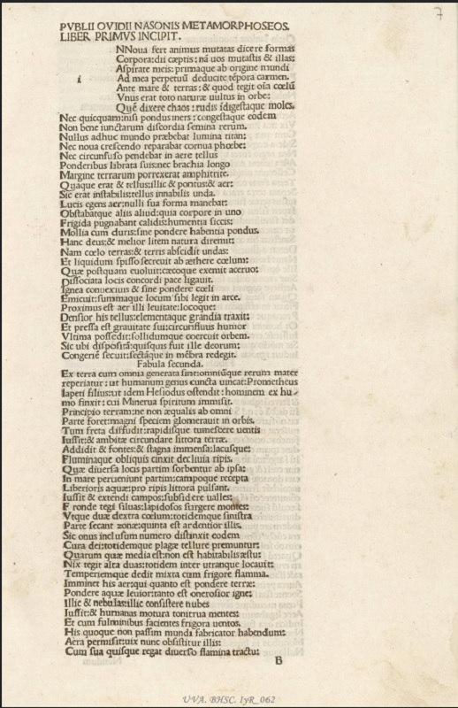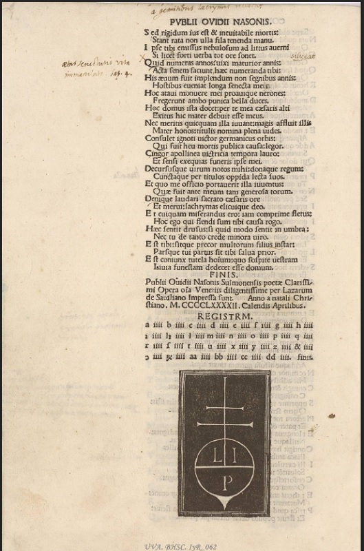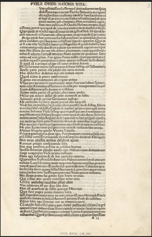 Publio Ovidio Nasón (Sulmona, 20 de marzo de 43 a. C.-Tomis, 17 de marzo de 17 d. C.) fue uno de los grandes escritores romanos del que se ha conservado un mayor número de obras manuscritas e impresas. Esta edición incunable veneciana comprende: las Metamorfosis y el Arte de amar, las Heroidas, Cartas de grandes enamoradas, y sus Tristia, poemas elegíacos en que lamenta su destierro.