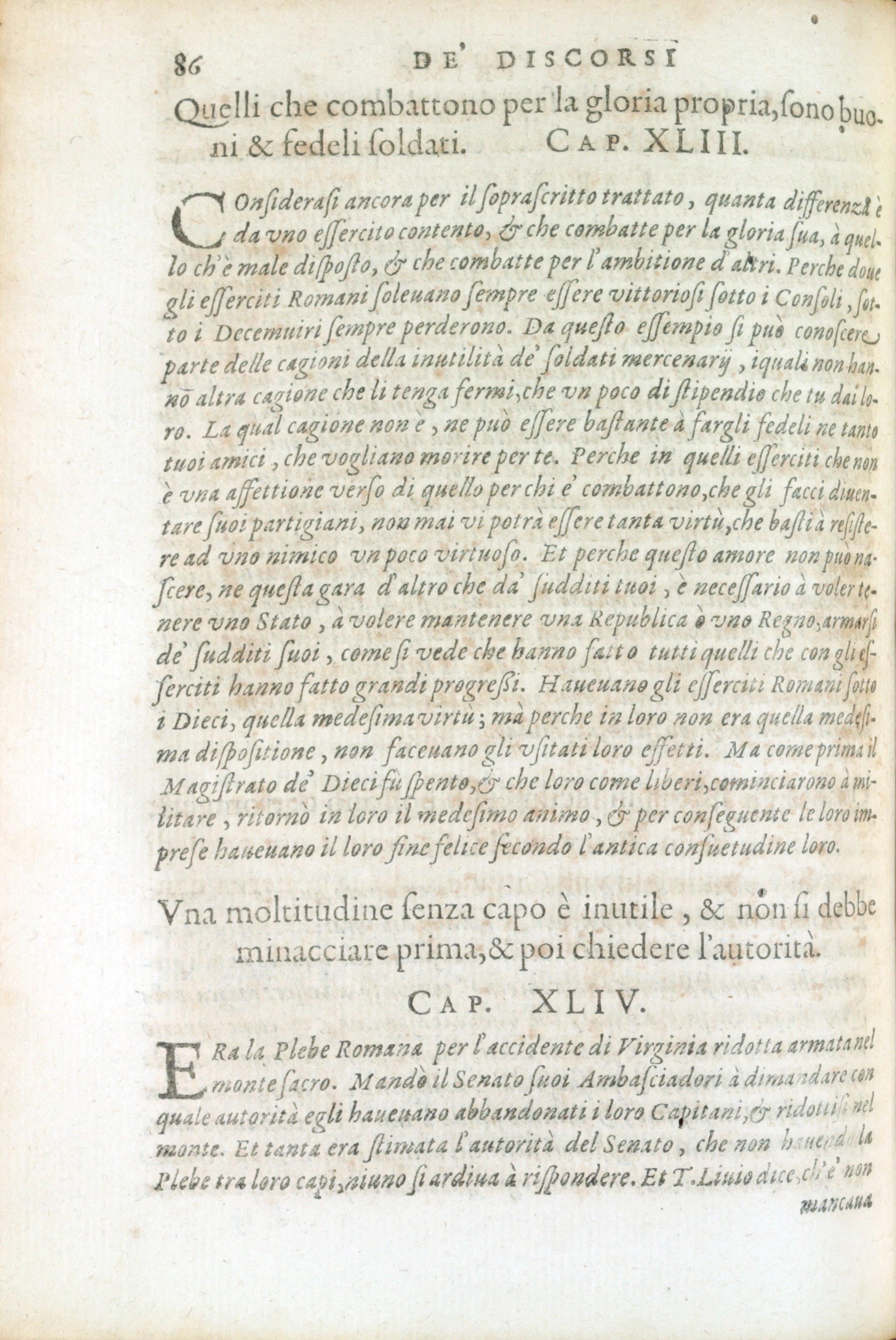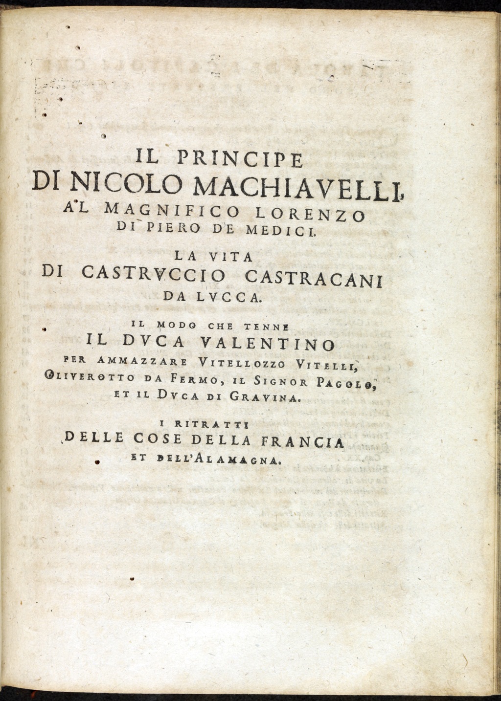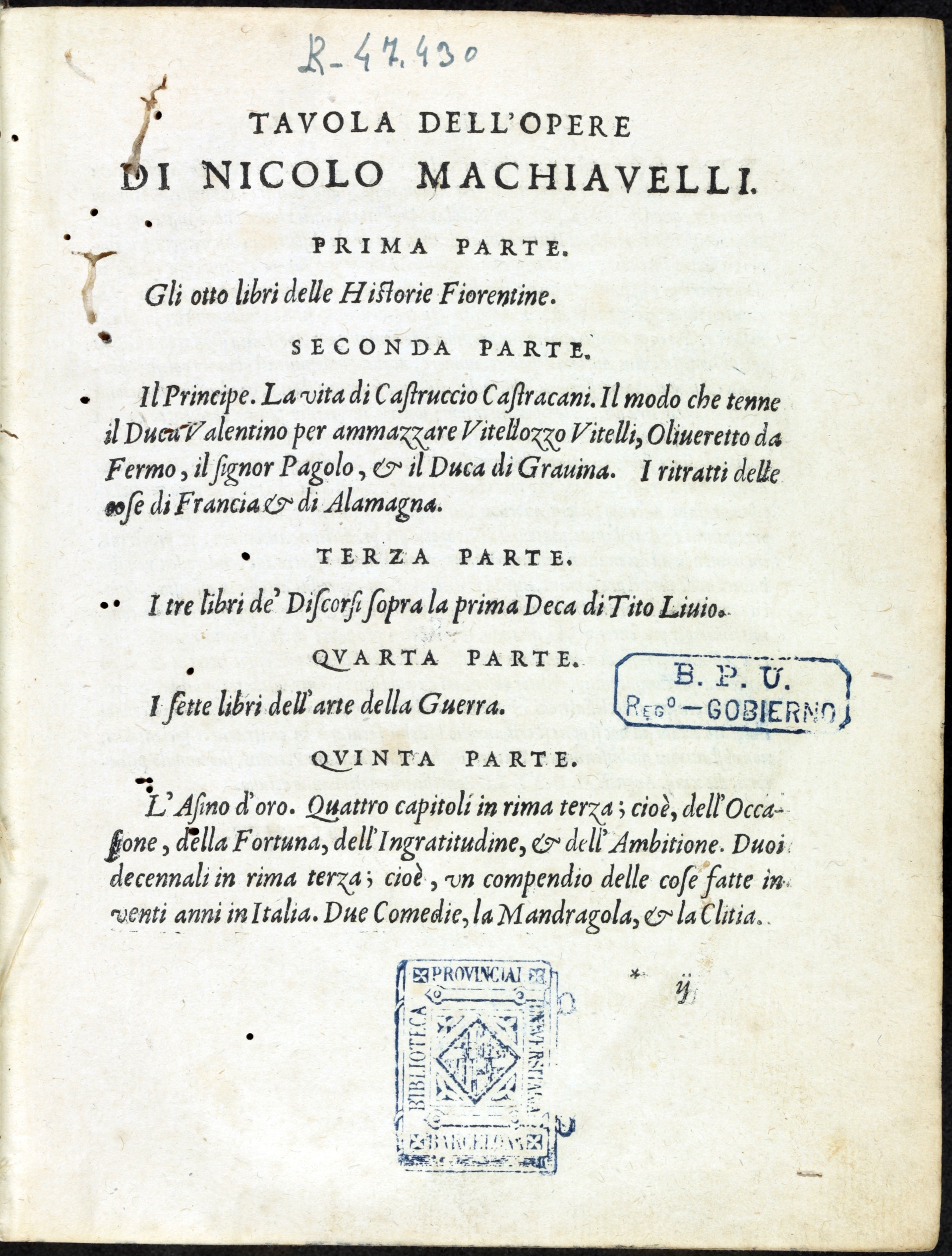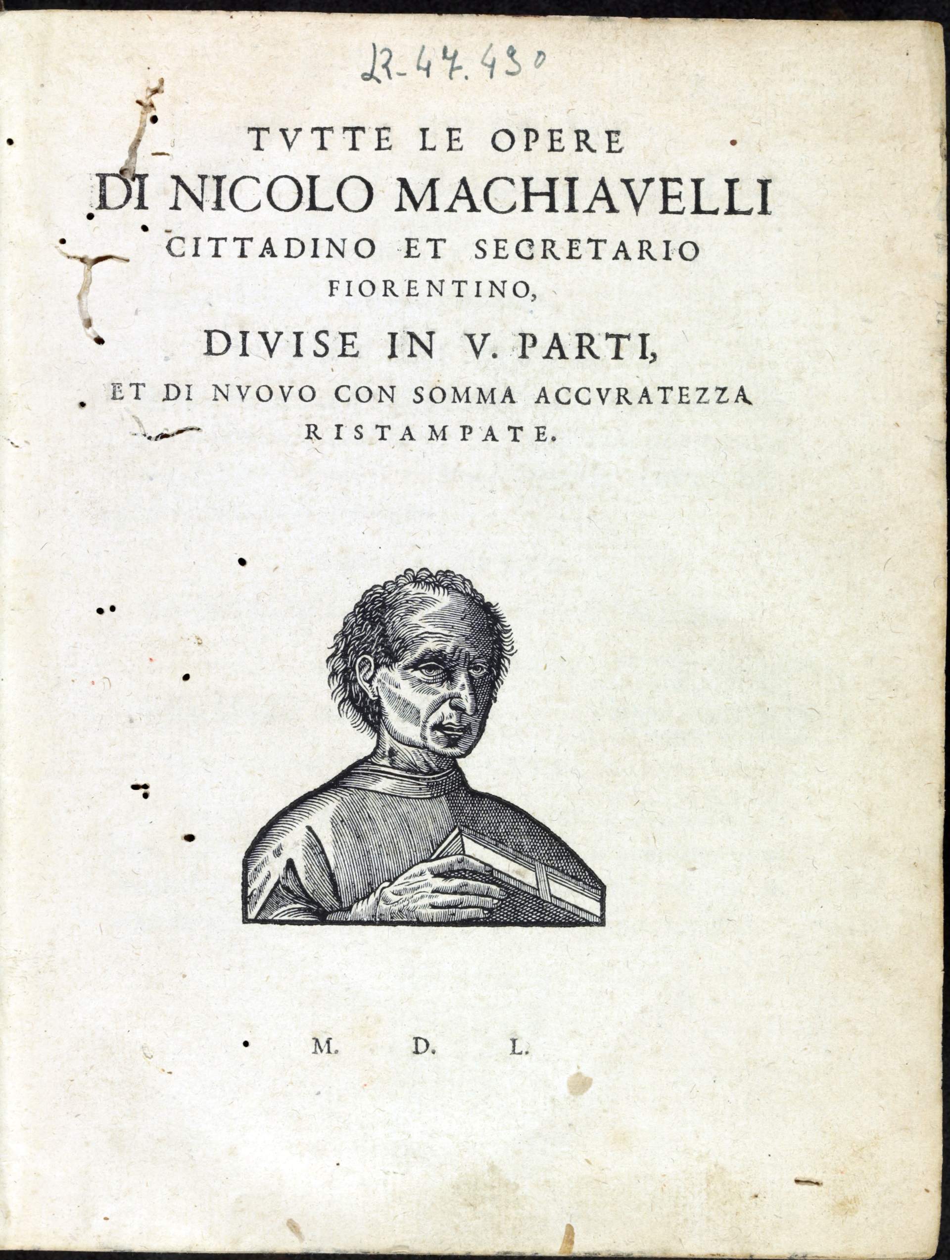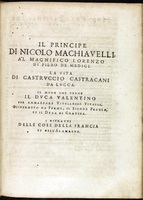 La presente edición pertenece al grupo de las ediciones contrahechas denominadas Testina —cabeza pequeña en italiano—, por el retrato del autor que aparece en la portada de todas ellas junto con el año 1550 en cifras romanas. Aunque las obras de Maquiavelli fueron incluidas en el Índice de libros prohibidos romano de 1559, su difusión fue imparable por toda Europa. Las fuentes indican que esta edición fue impresa en Ginebra aproximadamente en 1635.