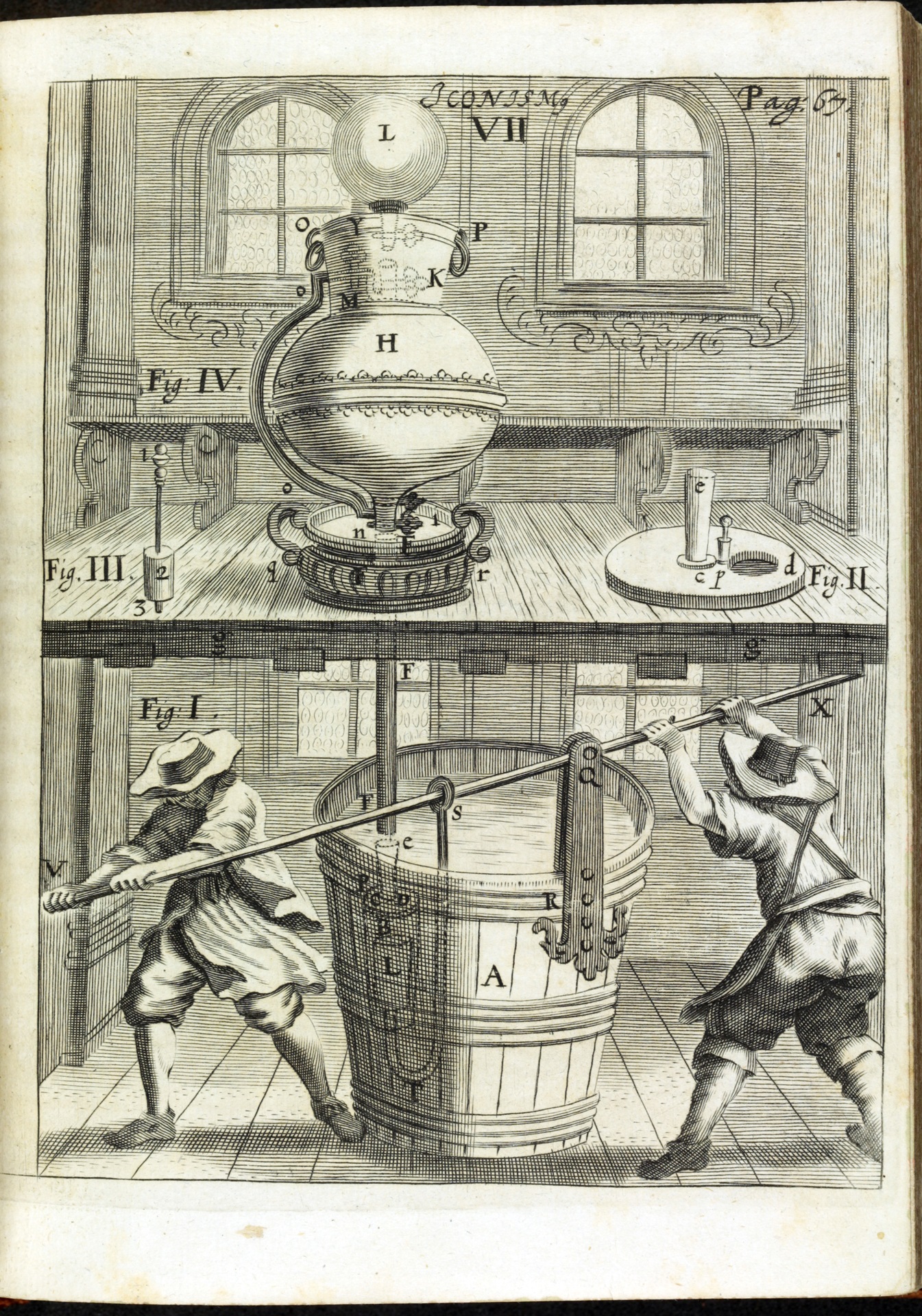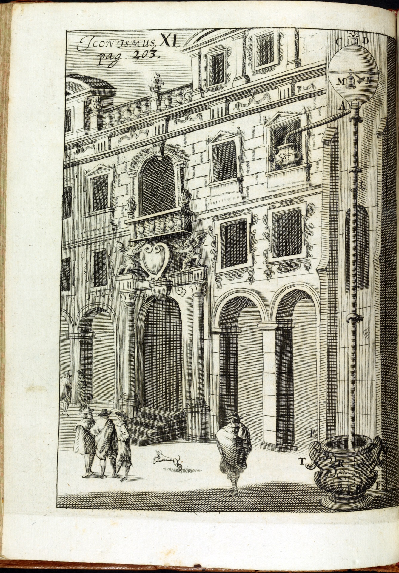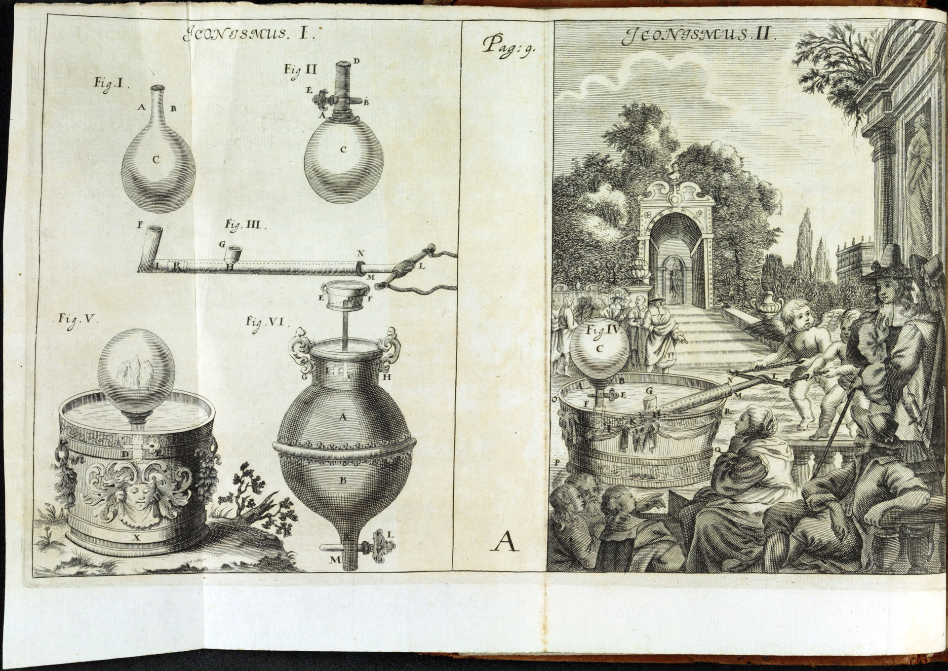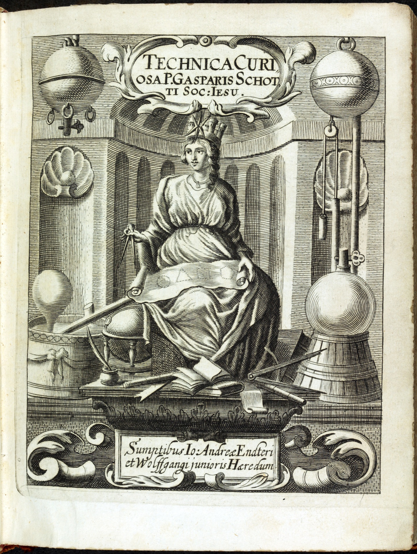 El jesuita alemán Gaspar Schott mantuvo una trayectoria vital estrechamente ligada a la de su mentor, Athanasius Kircher —presente en la sección Bellas artes de esta misma exposición—, de quien fue alumno en la Universidad de Würzburg. Durante su exilio por la Guerra de los Treinta Años, que lo llevó de Bélgica a Sicilia, donde ejerció como profesor en Palermo, Schott sostuvo una constante correspondencia con su maestro durante dos décadas. En 1652, Kircher, asentado en el jesuítico Colegio Romano, solicitó su colaboración en Roma. Allí permanecieron juntos hasta 1655, fecha en la que Schott regresó a Würzburg para dedicarse a la docencia y a la publicación de sus tratados sobre matemáticas, física e historia natural.