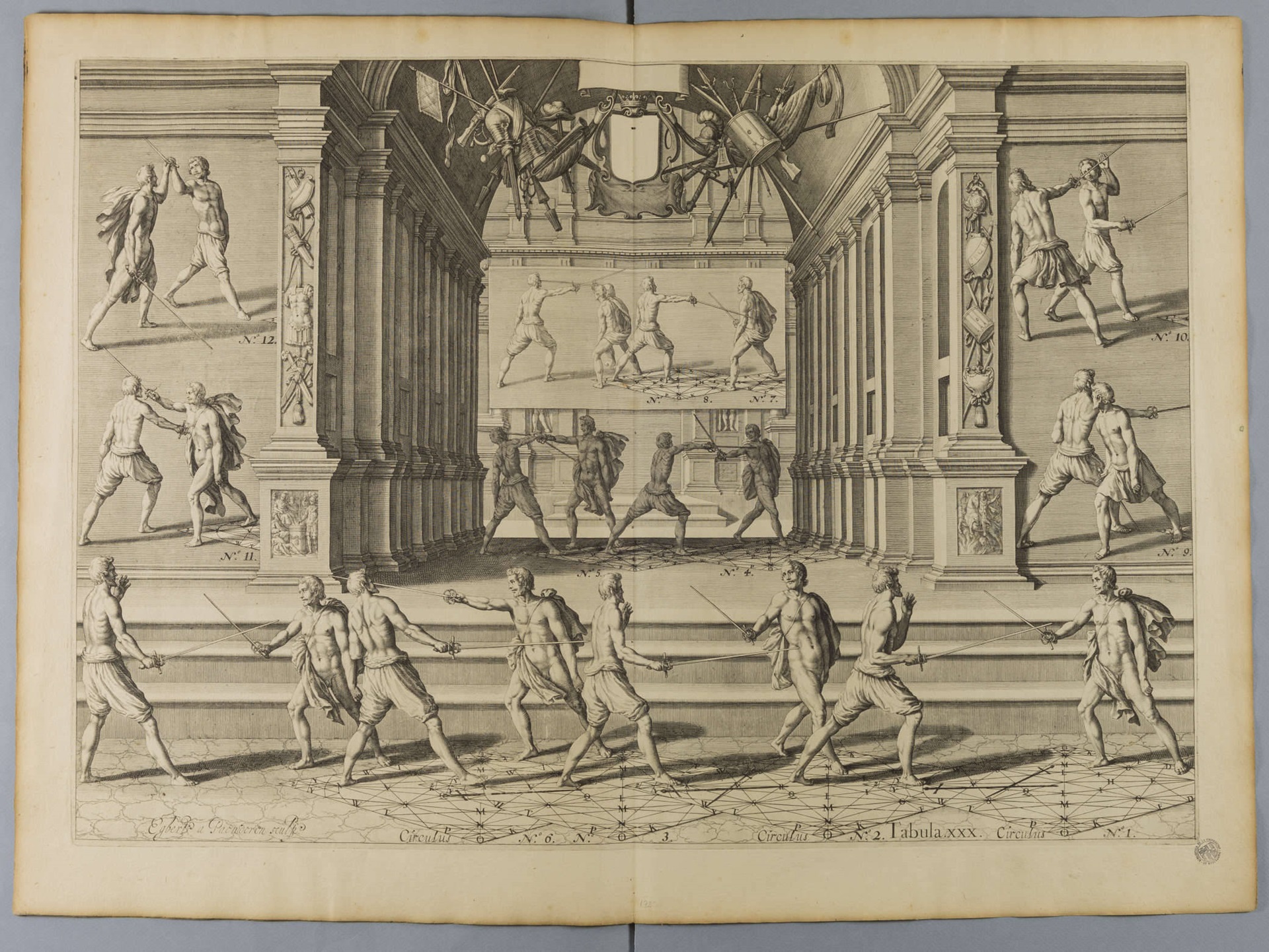 Su impresión estuvo a cargo de los Elzevier de Leiden, cuyas ediciones fueron famosas por su perfección, en especial las de formato en 12º. En esta ocasión, en cambio, produjeron un libro de tamaño inusualmente grande, para el cual se fabricaron especialmente los florones, viñetas, frisos e iniciales. Merecen una especial atención las láminas dedicadas a la esgrima, casi todas a doble página, donde los espadachines ostentan una gran variedad de vestimentas en suntuosos escenarios. Destacan asimismo los dos grabados al principio del libro segundo, que celebran el triunfo de la esgrima. Fue Thibault mismo, probablemente, el creador de las ilustraciones, mientras que por lo que respecta a los grabadores, solicitó la participación de un total de dieciséis, activos sobre todo en los Países Bajos.