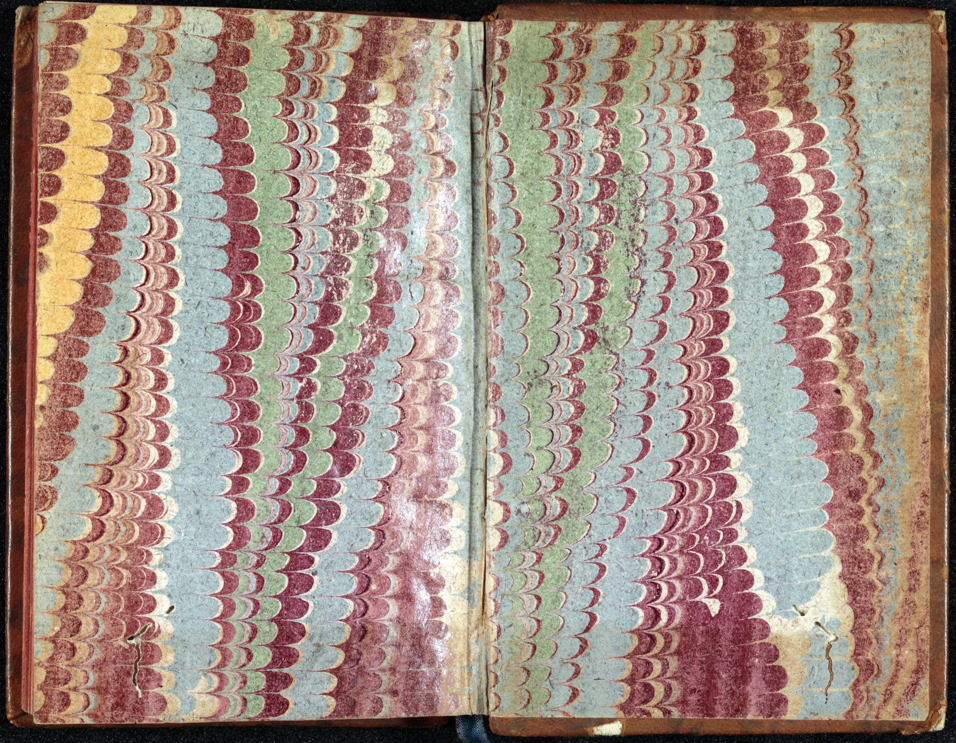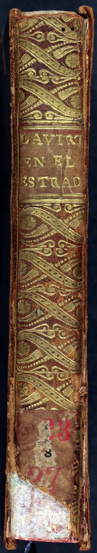 En la copia que presentamos de la edición de 1764, en piel jaspeada, posiblemente decorada con plantilla y pincel, o pequeña brocha, destacan los bonitos dorados en el lomo y las guardas marmoleadas tipo peine.
