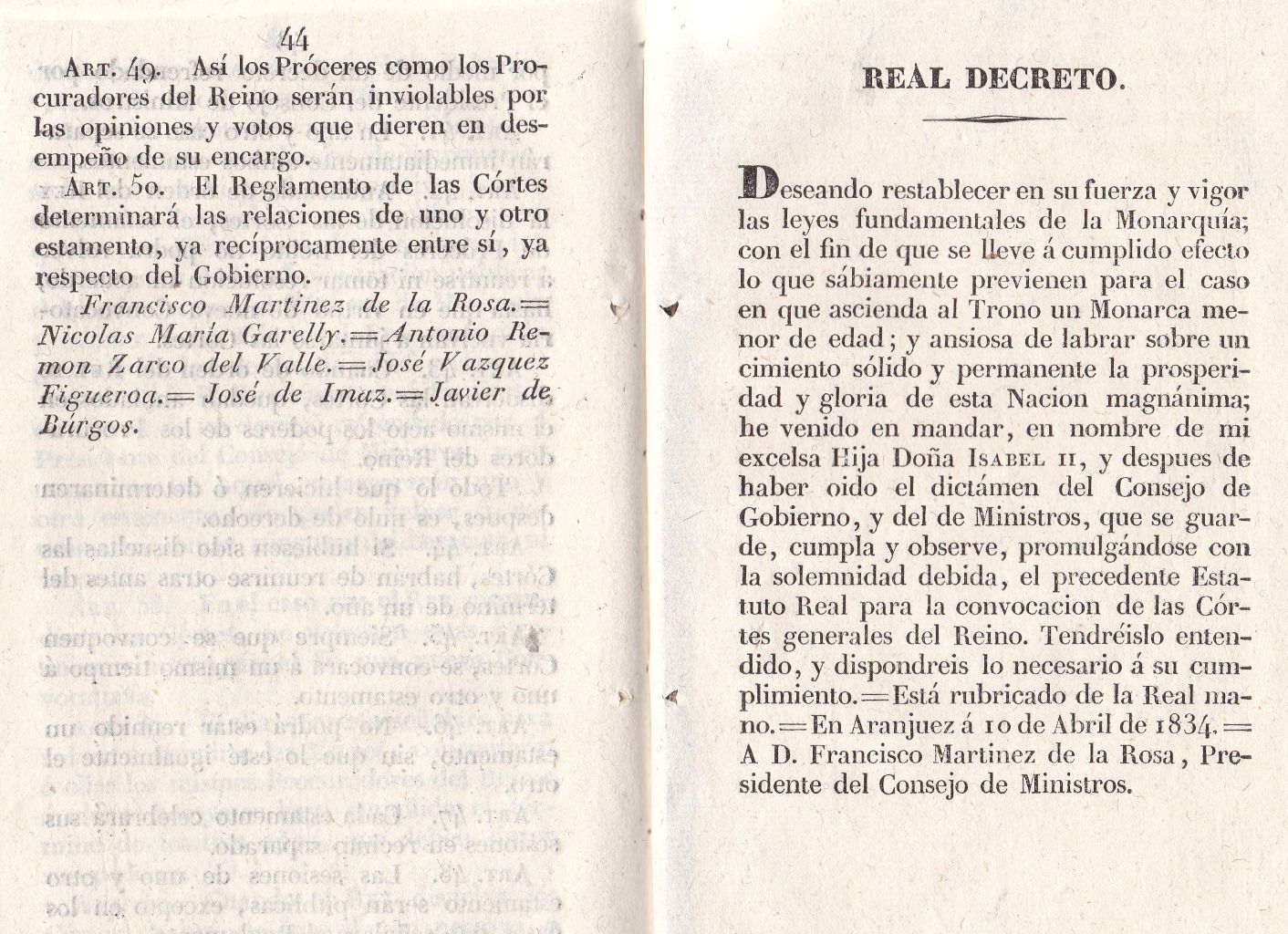Este estatuto fue promulgado el 10 de abril de 1834 como parte de la transición institucional tras la muerte de Fernando VII, y antes de las constituciones españolas posteriores.