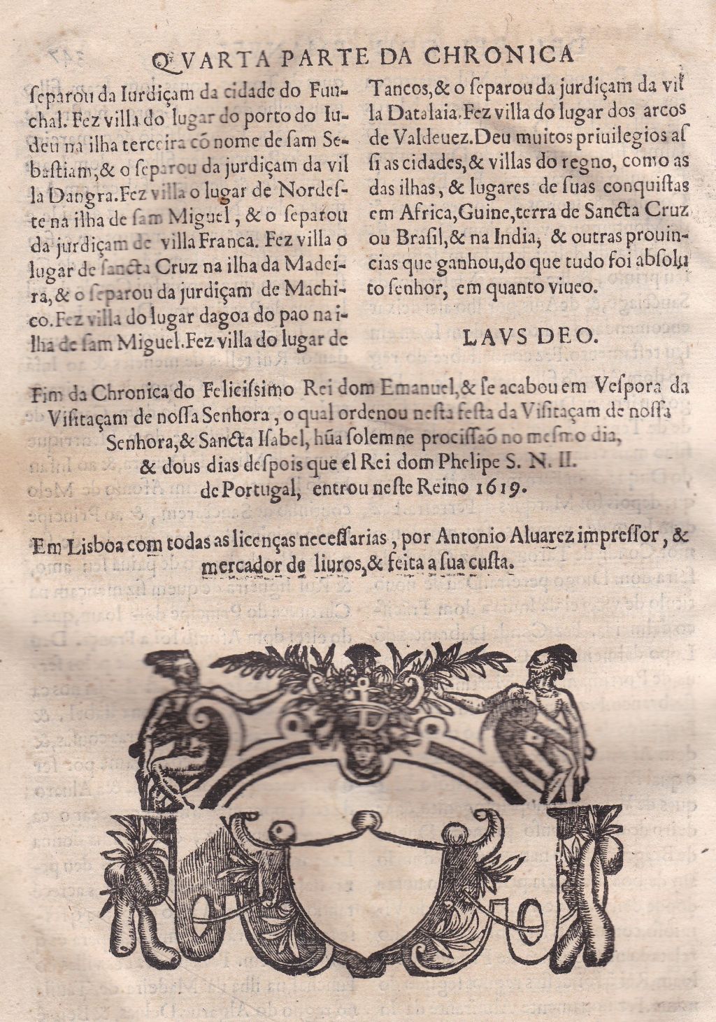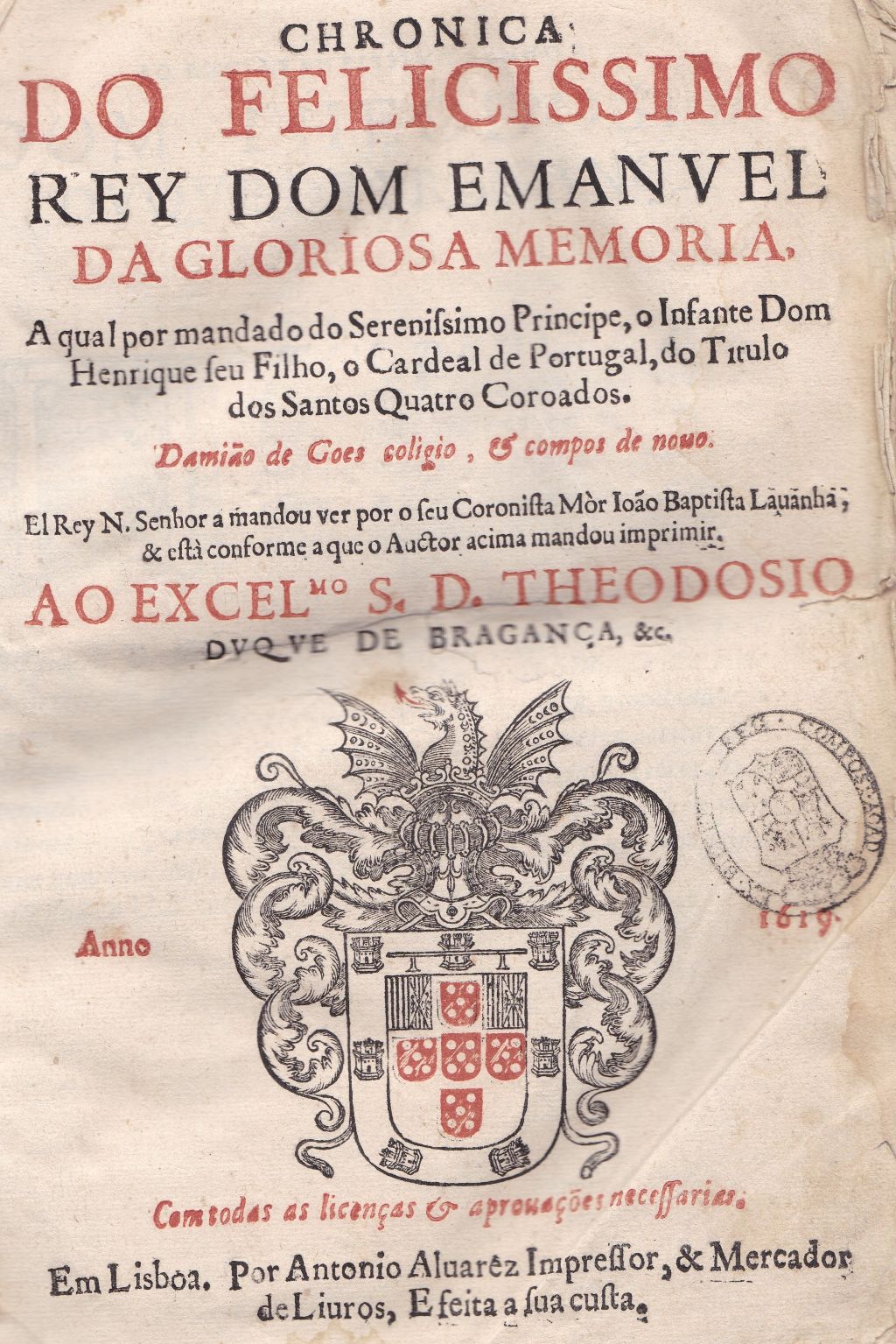 Esta edición, impresa en Lisboa en 1619 por António Alvares, incluye en su portada, impresa a dos tintas, el escudo xilográfico de Portugal y el ejemplar de la Biblioteca de la Universidade de Santiago de Compostela muestra hasta tres signaturas topográficas distintas de la Biblioteca del Duque de Osuna: “40” en la cubierta anterior, en grande y a tinta; “135-3” “a lápiz” en la contratapa; y “Plut. V Lit H Nº 23”, la famosa signatura “plúteo”, propia de la Casa del Infantado, antes de integrarse en la Biblioteca del Duque de Osuna.