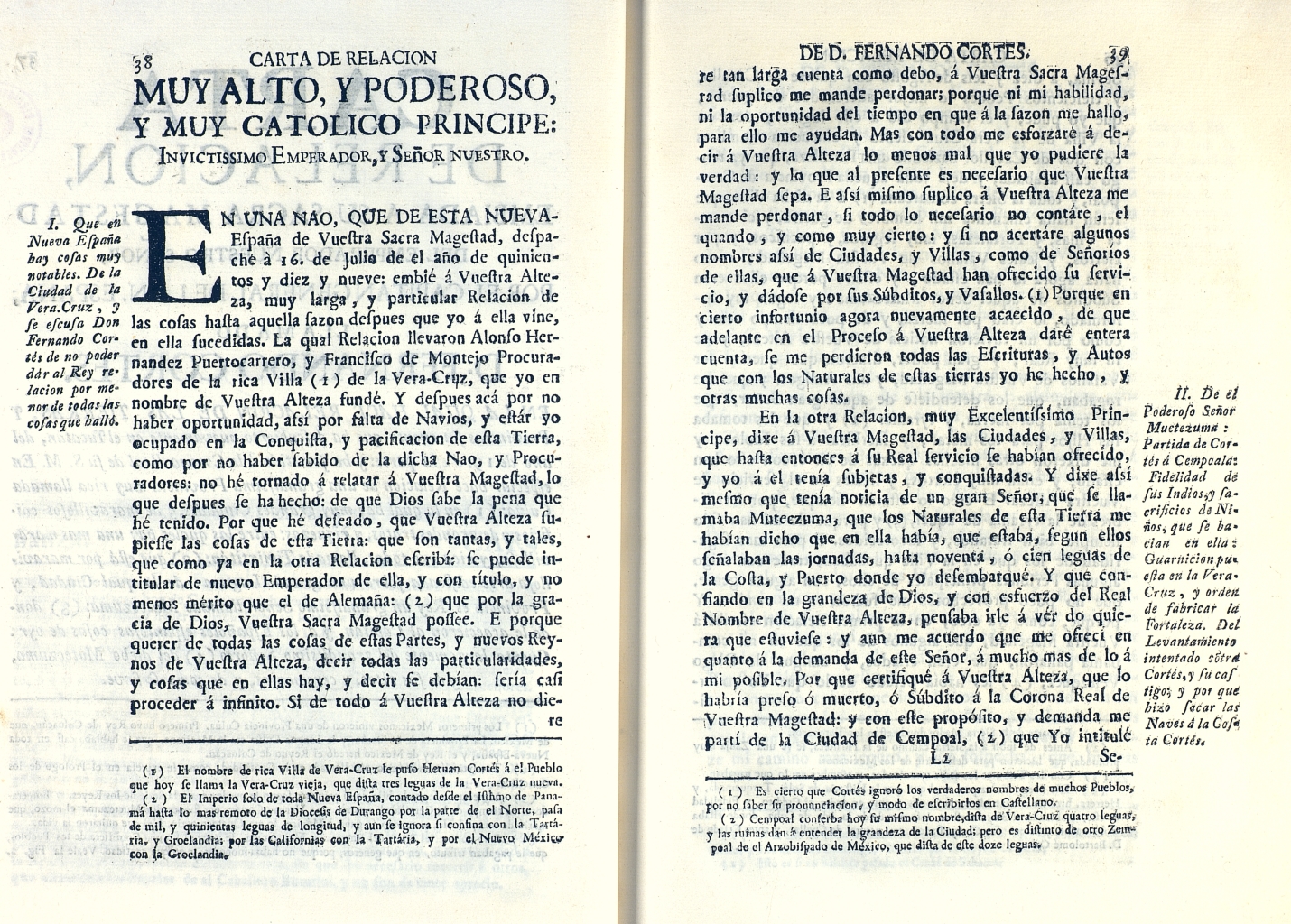 Esta obra reúne las Cartas de Relación enviadas por Hernán Cortés al emperador Carlos V dando cuenta detallada de su expedición. Francisco Antonio de Lorenzana, arzobispo de México en el S. XVIII, las edita por primera vez e incluye un estudio introductorio y anotaciones en las que comenta aspectos de la cultura indígena que amplían y mejoran el contenido de las cartas. A su vez, intercala un texto llamado Cordillera de los pueblos, que antes de la conquista pagaban tributo a el emperador Muctezuma. La originalidad de la edición reside precisamente en las notas, bien documentadas, enriquecidas, en ocasiones, con observaciones personales. Destaca la ilustración preliminar y los grabados representando el Gran Templo de México y el Calendario mexicano.