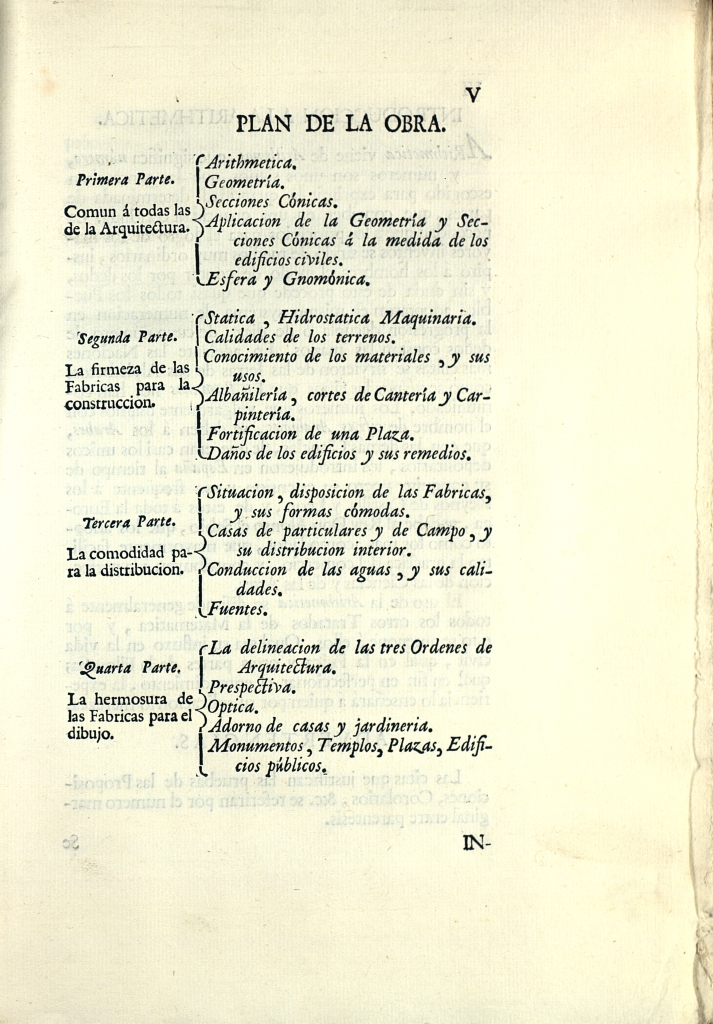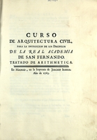 La de San Fernando se creó para estudiar las artes, entre ellas la arquitectura, la escultura y la pintura. Como apoyo al estudio, publicaba manuales en forma de cursos o tratados, como este Curso de arquitectura civil, dirigido a formar arquitectos según las directrices clasicistas del momento, frente a los excesos barrocos. Comprende un plan completo de enseñanza, dividido en distintas partes, siendo la aritmética una subdivisión de la primera, dedicada a conocimientos básicos de las matemáticas. Se imprimían habitualmente en la Imprenta Real, pero también en talleres madrileños vinculados al mundo académico y editorial ilustrado, como el renombrado de Joaquín Ibarra.