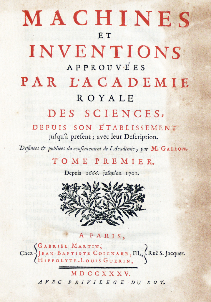 Una de las funciones esenciales de la Academia era examinar las máquinas e invenciones presentadas por particulares y otorgarles una validación oficial. Machines et inventions tiene la finalidad de reunir, ordenar y publicar estas evaluaciones. Gallon, como editor autorizado, recopiló y organizó cronológicamente los informes, describiendo cada máquina, su funcionamiento y su utilidad, siempre acompañados de grabados basados en los dibujos originales entregados a la institución.