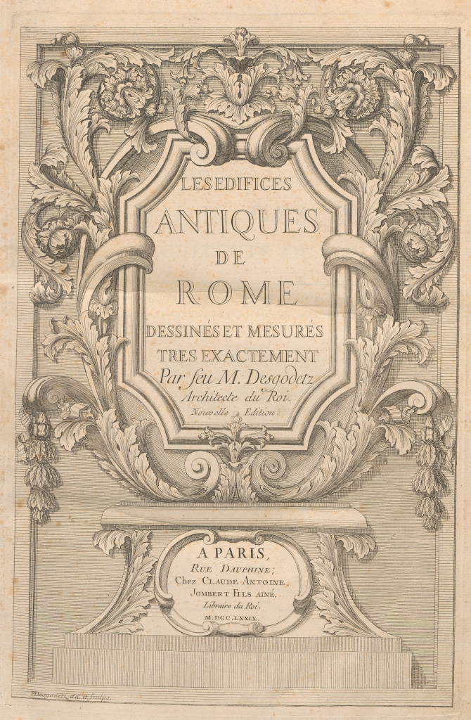 Esta obra –cuya primera edición data de 1682– no es una más de las infinitas escritas sobre Roma y sus antigüedades. Enviado a la Ciudad Eterna, con tan solo 20 años, por la Académie Royale d’Architecture de París para medir los antiguos monumentos de la ciudad, Desgodets (o Desgodetz) se permitió corregir, tras unas mediciones minuciosas y mucho más precisas que cualquier otra antes realizada, tratados clásicos como los de Vitrubio, o renacentistas como Serlio, Palladio o Labacco. En 1719, Desgodets sería nombrado arquitecto real y profesor en la misma academia y es uno de los representantes más importantes del clasicismo francés.