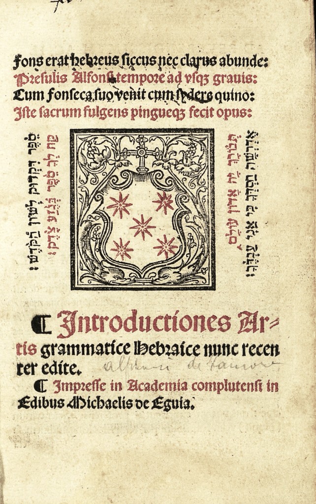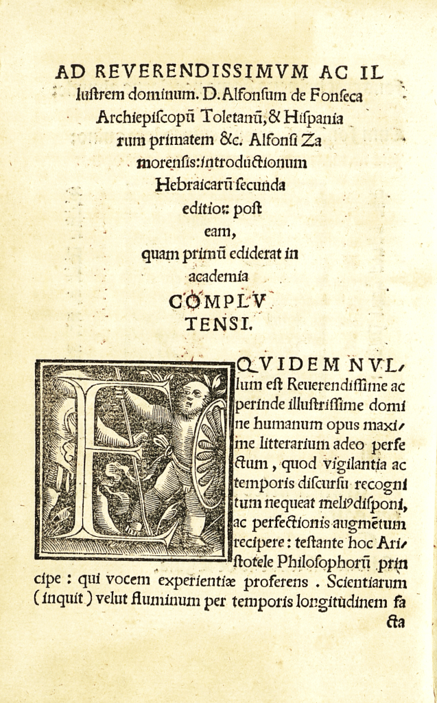 Precisamente, la primera vez que esta gramática vio la luz en 1515 –en el título de esta edición se afirma que «ahora está recientemente publicada»–, formaba parte del sexto volumen de la Políglota y sin nombre explícito del autor. En esta de 1526 el nombre de Zamora aparece en la dedicatoria, donde se habla de «secunda editio» y el autor afirma haberla corregido y ampliado significativamente respecto de la primera.