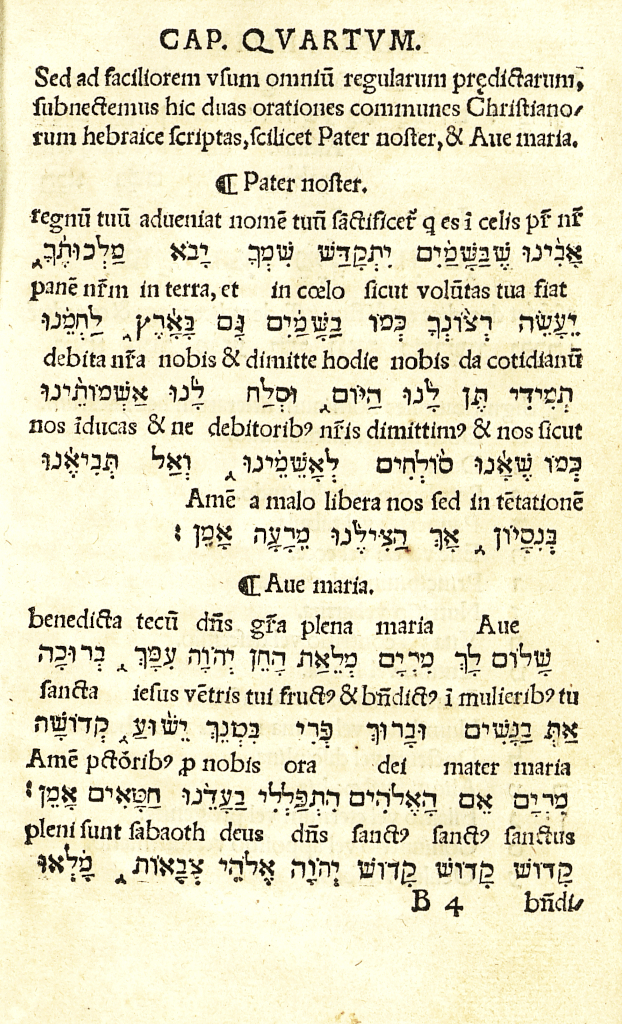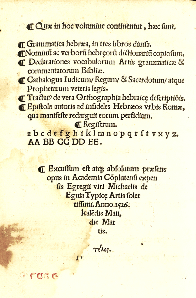 Esta introducción gramatical tiene una marcada finalidad pedagógica, para acoplar la lengua hebrea en las categorías de la gramática latina, para hacerla así más accesible a un lector cristiano. Incluye un breve vocabulario hebreo, una ortografía y algunos textos bilingües, en latín y en hebreo, para facilitar el aprendizaje a los estudiantes –el Credo, el Padrenuestro y el Avemaría–.