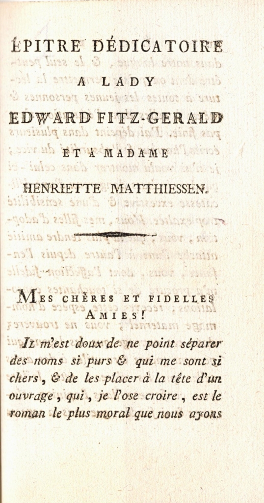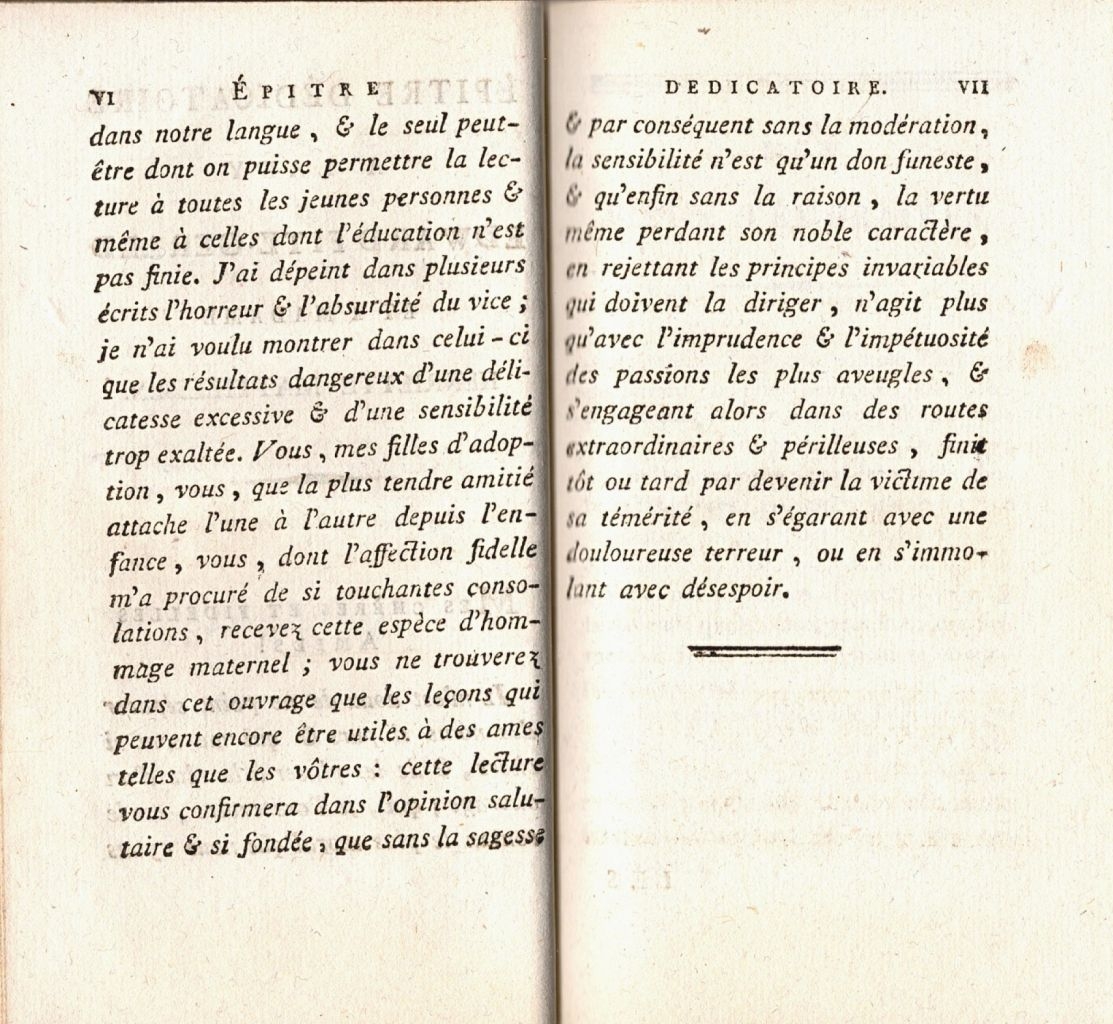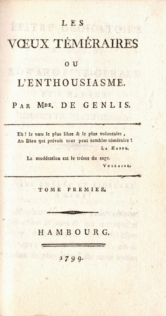Su novela Les vouex téméraires, publicada en 1798, todavía en el exilio, se enmarca en ese género narrativo con una clara finalidad pedagógica, basada en los principios religiosos y morales del catolicismo, frente a la propuesta de los «filósofos» franceses. En el prólogo, la autora insiste en que el contenido sentimental del argumento está al servicio de la moderación y de la virtud, que deben dominar un deseo impetuoso –el entusiasmo– que lleva a realizar promesas –los votos– que solo conducen a la infelicidad.