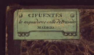 Otro detalle digno de destacar en este ejemplar es la etiqueta impresa pegada en la guarda de la encuadernación del volumen primero («Cifuentes lo enquadernó calle de Preciados Madrid»), correspondiente a uno de los encuadernadores más célebres con los que trabajó la biblioteca ducal: Francisco Cifuentes, encuadernador madrileño, que trabajó en la corte a principios del siglo XIX (véase la imagen Osuna_06_06_02).
