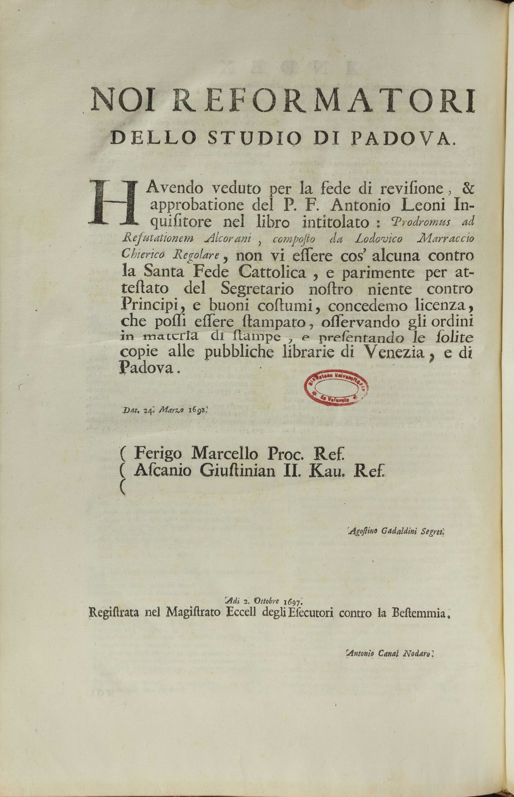 La obra está impresa en Padua, por la Tipografía del Seminario, en 1698 y se trata de una edición monumental, con texto a dos columnas y un amplio aparato tipográfico. Según el Istituto Centrale per il Catalogo Unico delle Bibliotheche Italiane de ella existen dos emisiones, la que nos ocupa en un solo volumen, y otra que se publicó en dos volúmenes, con el mismo pie de imprenta, pero con portada y composición tipográfica diferente.
