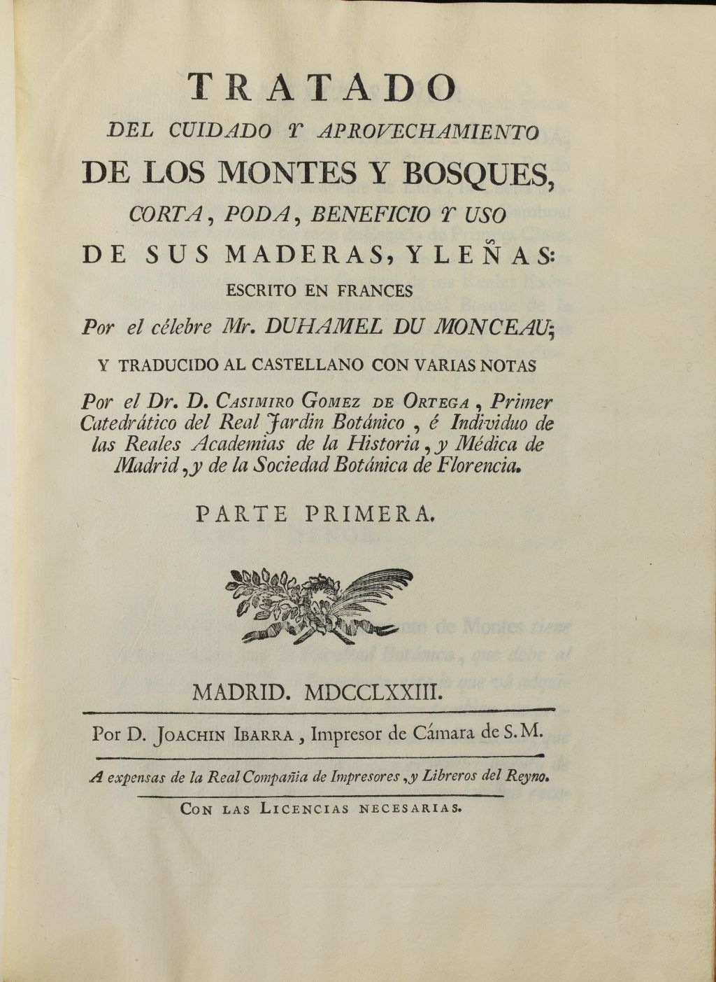 La traducción al castellano fue realizada por Casimiro Gómez Ortega (1741–1818), médico y botánico, director del Real Jardín Botánico de Madrid. Figura clave de la Ilustración española, promovió expediciones científicas y contribuyó a la difusión del conocimiento botánico mediante traducciones de importantes obras, como esta de Duhamel Du Monceau, y la redacción de manuales y tratados.
