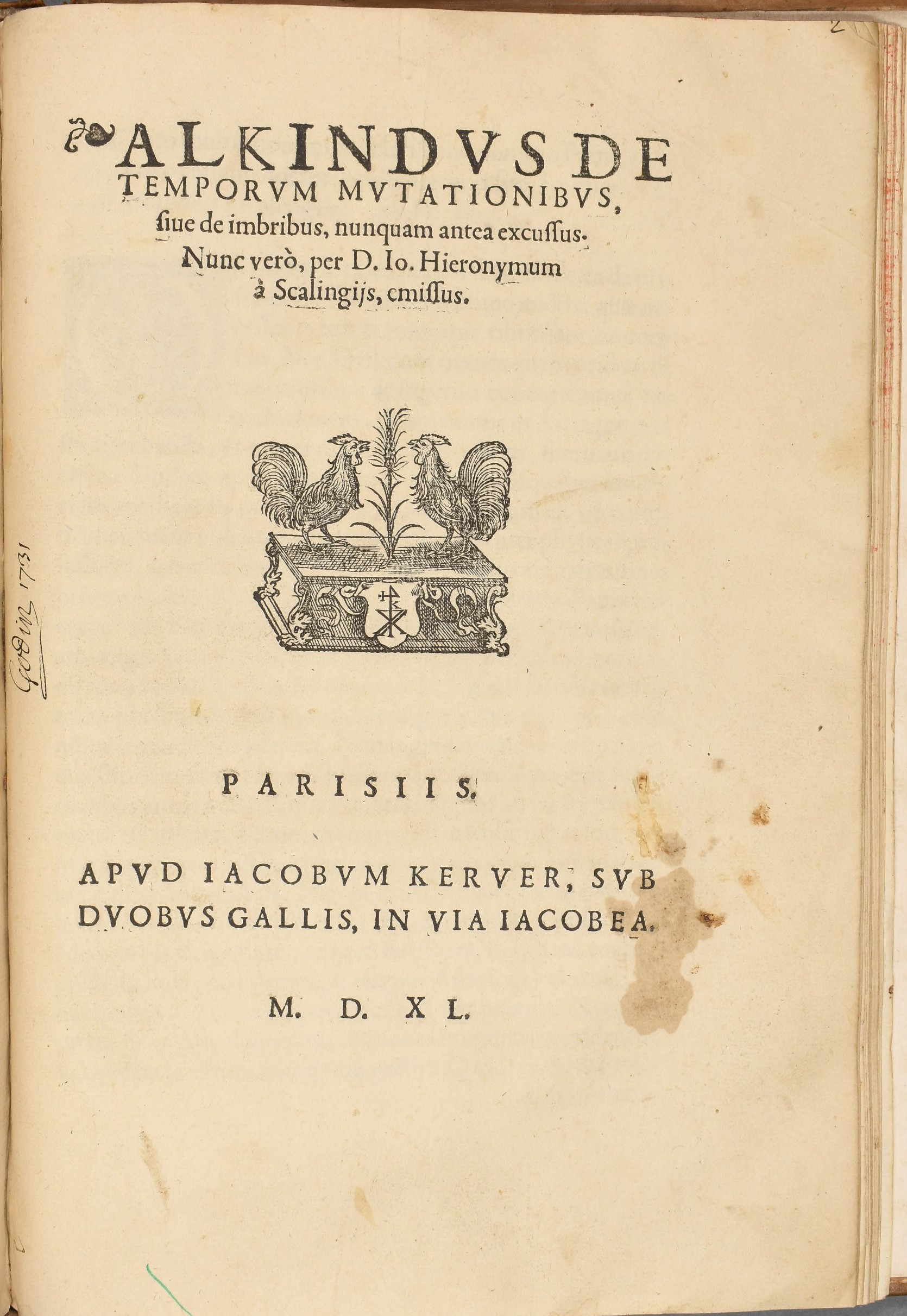 El ejemplar complutense, uno de los pocos existentes en España, tiene numerosas marcas de lectura y de propiedad anteriores a su incorporación a la Biblioteca del Duque de Osuna. Además, está encuadernado, en piel, con otra obra pionera en el campo de la meteorología: De temporum mutationibus, sive de imbribus, nunquam antea excussus, una obra atribuida al sabio árabe Alkindus (Al-Kindi), publicada por primera vez en París en 1540 [BH MED 158 (2)]