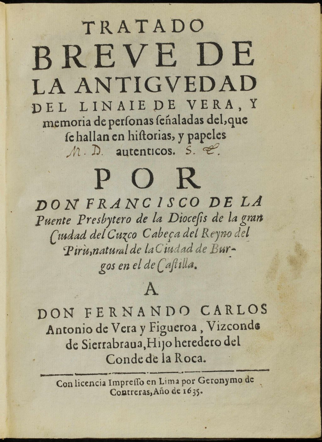 Tratado genealógico del presbítero de la diócesis de Cuzco, Francisco de la Puente, que es el seudónimo utilizado por el agustino fray Fernando de Vera, obispo de Bujía.