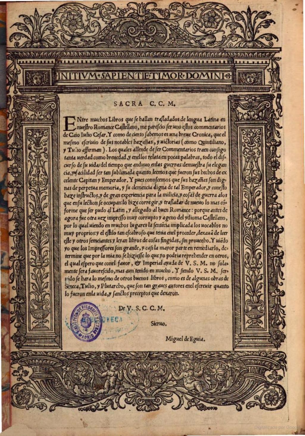 En esta obra, el editor navarro firma un prólogo dedicado al Emperador (fol. [Cruz griega]1v) en el que justifica el interés de su trabajo y explica en parte la labor editorial realizada. Le sigue todo el corpus cesariano, además de una tabla y un índice alfabético de nombres propios, que ya están en las ediciones anteriores y no son, por tanto, una aportación de Eguía (Ayuso, 2020).
