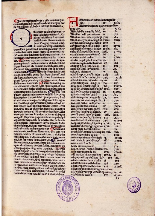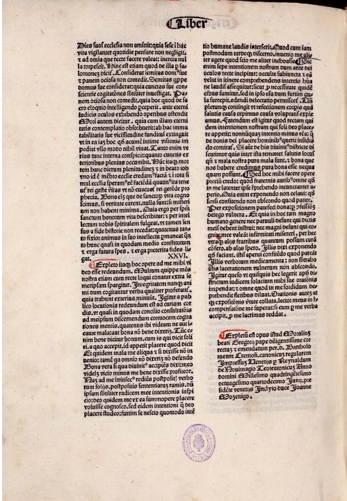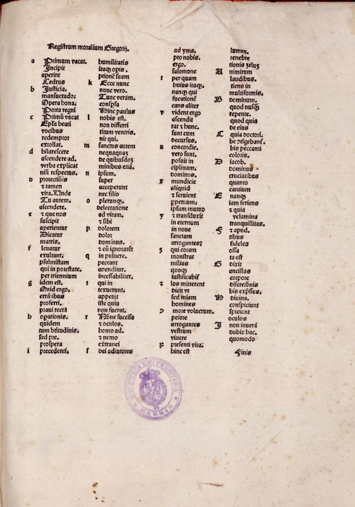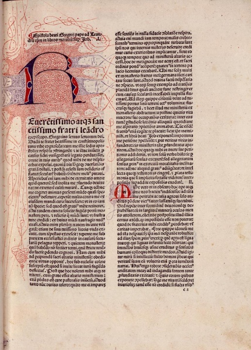 Con una voluminosa obra, fue, también, uno de los autores más estimados en la Edad Media. Uno de sus textos más valorados, Moralia, sive Expositio in Job, recoge extensos comentarios y reflexiones sobre diferentes cuestiones morales planteadas en el Libro bíblico de Job. La parte fundamental de la obra fue escrita, a partir de los sermones que pronunció, a petición de su amigo, Leandro de Sevilla, en la comunidad monástica en la que residió durante su estancia en Constantinopla entre 579 y 585, si bien el trabajo se completó en Roma, años después, conformando un comentario continuo, dividido en 35 capítulos. Su contenido moral hizo que fuera una de las obras más difundidas, leídas y copiadas durante la Edad Media. En época incunable también conoció varias ediciones, siendo esta veneciana de 1480, en las prensas de Raynaldus de Novimagio, una de las más destacadas.