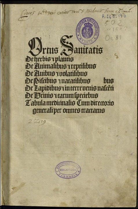 Este incunable anónimo de tema médico, Hortus sanitatis, considerado como uno de los primeros impresos de historia natural, está atribuido, no sin ciertas reservas, a un médico alemán, Johann Wonnecke von Caub, más conocido por su nombre latinizado, Johannes de Cuba (1430-1503) que empleó numerosas fuentes medievales y contemporáneas para su composición. A la primera edición alemana de 1485, le siguieron otras dos en latín, en 1491 y 1497, a manos de Jacob von Meydenbach, en Maguncia, las tres ricamente ilustradas con grabados xilográficos que explican, en parte, el éxito obtenido por la obra y las sucesivas reimpresiones en otras ciudades, como esta realizada en Estrasburgo en 1497, por Johann Pruss.