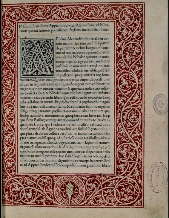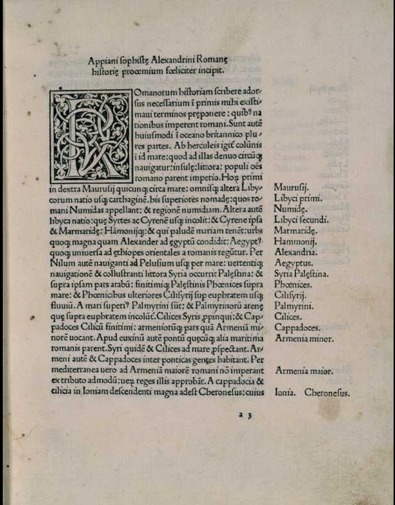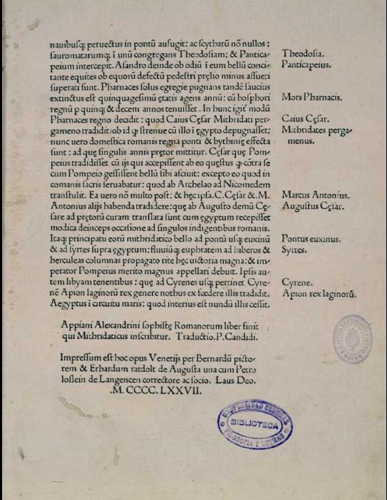 La labor de síntesis de Apiano, a partir de la compilación y selección de fuentes muy diversas, tan evidente en su obra, no ha sido muy bien tratada por la historiografía, que siempre ha desdeñado su trabajo frente a las de otros historiadores romanos. Sin embargo, contiene numerosos datos y, a veces, es la única fuente, o la más completa, de todas las conservadas. El texto original, en griego, escrito con un estilo sencillo y sin ninguna pretensión literaria, fue traducido al latín por Pier Candido Decembrio (1399-1477) en 1452 y comprendía dos partes: la primera contenía el Prólogo (Proemium), y los libros Sobre Africa (liber Libycus), Sobre Siria (liber Syriacus) y Sobre Mitridates (liber Mithridaticus); el segundo reunía los cinco libros de las Guerras civiles (libri Bellorum civilium), el libro Sobre Iliria (liber Illyricus) y el Epitome del libro Sobre la Galia (liber Gallicus). A esta versión latina se debe esta edición incunable veneciana de 1477, en cuarto, de la que solo se conserva la primera parte, con sello de la Biblioteca de la Casa de Osuna e Infantado y que carece, como la traducción original, del libro sexto dedicado a la Península Ibérica.