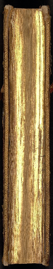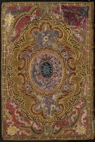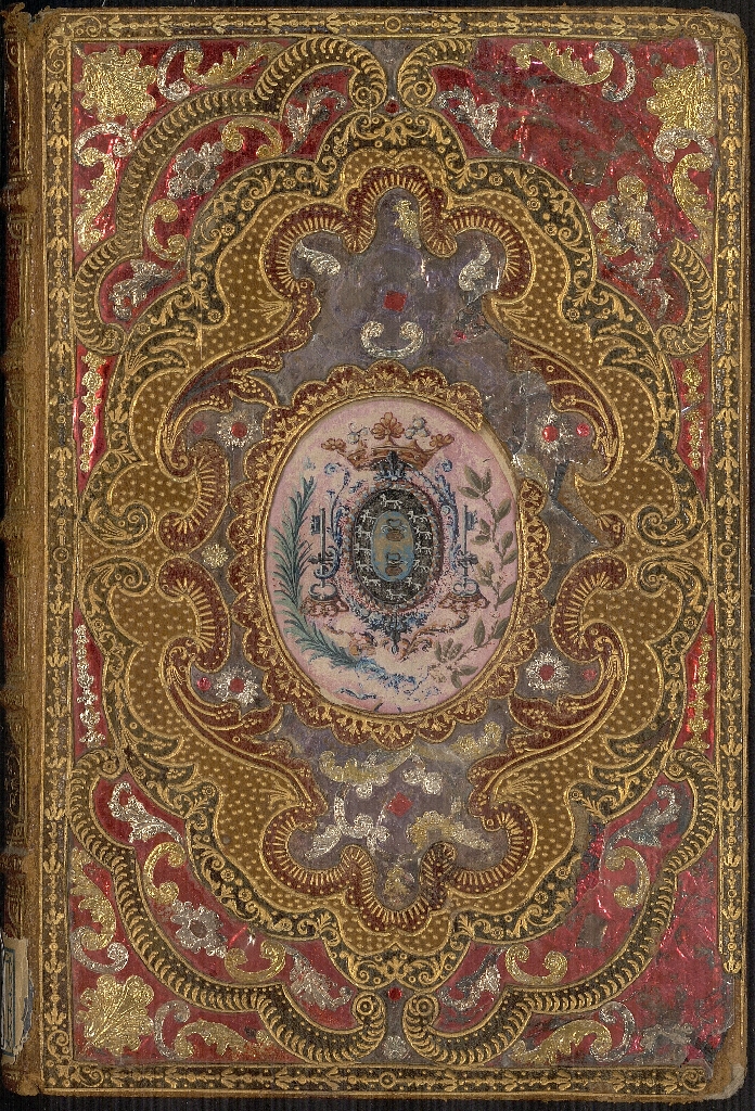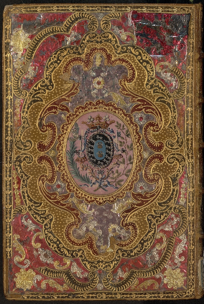Esta espléndida encuadernación en mosaico es de estilo rococó del s. XVIII, muy probablemente de Pierre-Paul Dubuisson, cubiertas simétricas con motivos geométricos y rocalla, incrustaciones en nácar, talcos metálicos, en el centro escudo inserto en espacio oval, lomo decorado a juego en mosaico con hierros dorados, en el segundo entrenervio tejuelo con título, guardas en seda azul, cantos, contracantos y cortes dorados.
