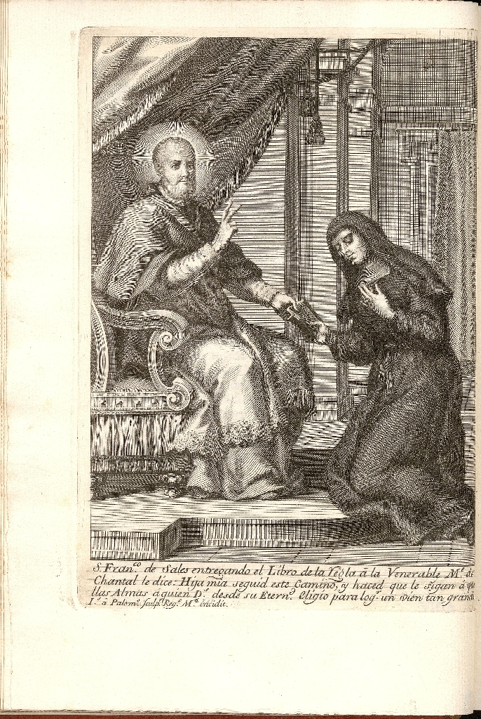 En la obra aparecen dos grabados calcográficos, el primero es el escudo real y el segundo representa a san Francisco de Sales sedente entregando el libro de la Regla a la santa arrodillada ante él. El grabado está realizado por Antonio Palomino, grabador de profunda formación humanista y que es considerado como uno de los principales teóricos de la pintura española del Barroco final.