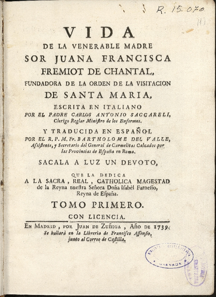 Vida de la venerable madre sor Juana Francisca Fremiot de Chantal, fundadora de la Orden de la Visitación de Santa María
