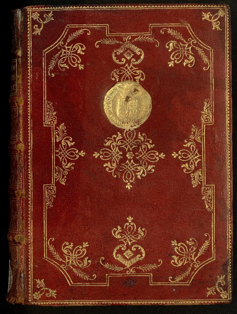 La encuadernación es de estilo rococó en piel roja del s. XVIII, decoración simétrica en ambas cubiertas con rueda dentada al exterior y filete al interior, flores doradas en las cuatro esquinas, orla interior quebrada de filetes geométricos y florones; en la cubierta anterior supralibros dorado del Duque de Osuna; lomo de seis entrenervios con hierros dorados, en el segundo entrenervio tejuelo de color marrón con título abreviado; guardas marmoleadas tipo peine con motivos vegetales dorados; cantos y contracantos dorados; y cortes dorados y cincelados.